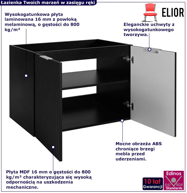 - Korpus z laminowanej płyty meblowej 16 mm odporny na wilgoć i codzienne użytkowanie, doskonale sprawdza się w warunkach łazienkowych.