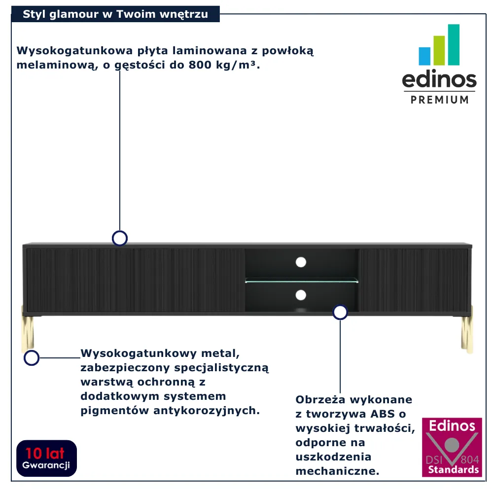 • Produkt posiada certyfikat jakości "Edinos Standards DSI 804", który potwierdza najwyższą jakość wykonania mebla oraz pełny stopień zgodności poszczególnych jednostek wytworzonego wyrobu z przyjętym wzorcem.