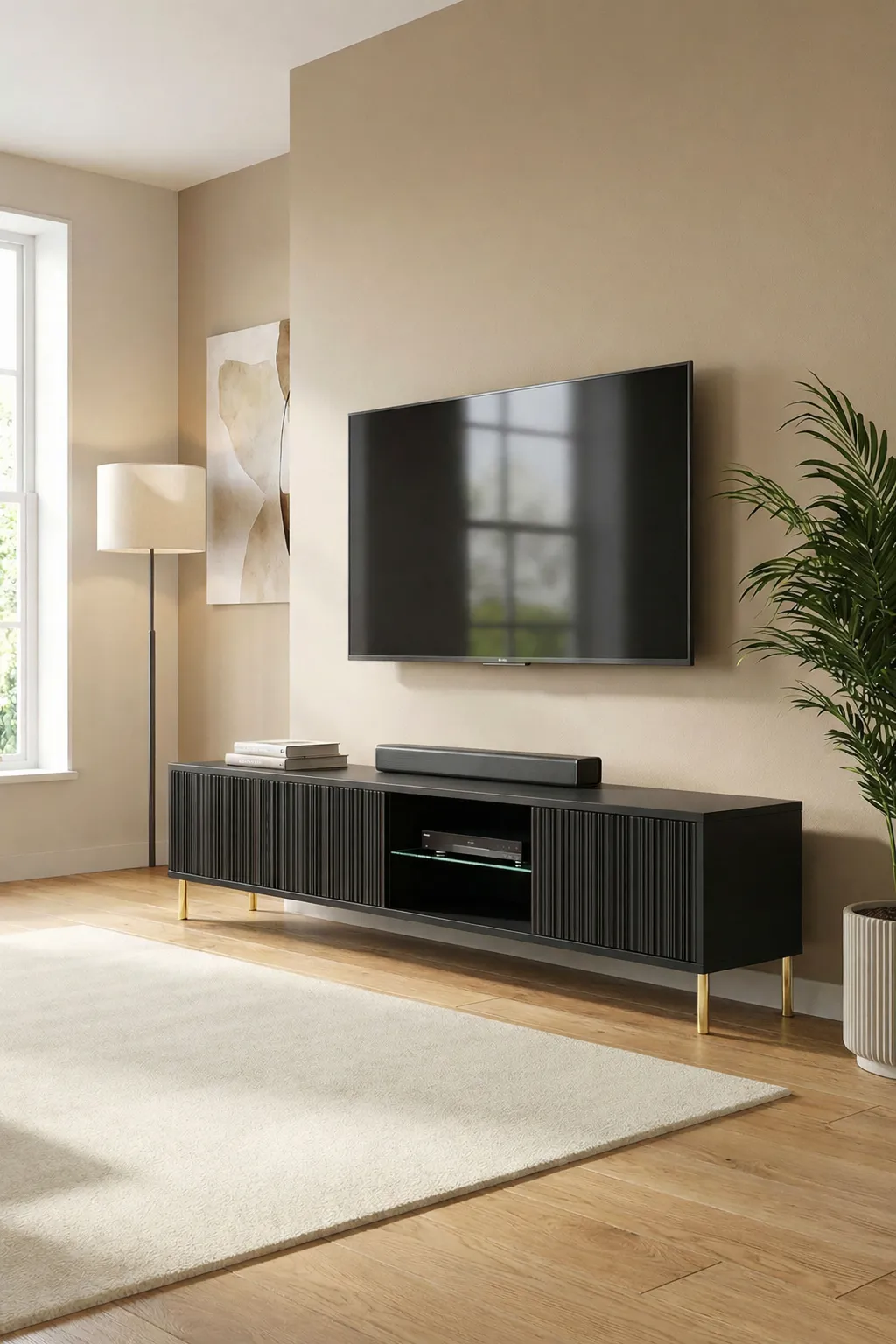 Przykładowa aranżacja z wykorzystaniem czarnej ryflowanej szafki RTV Murigio 7X