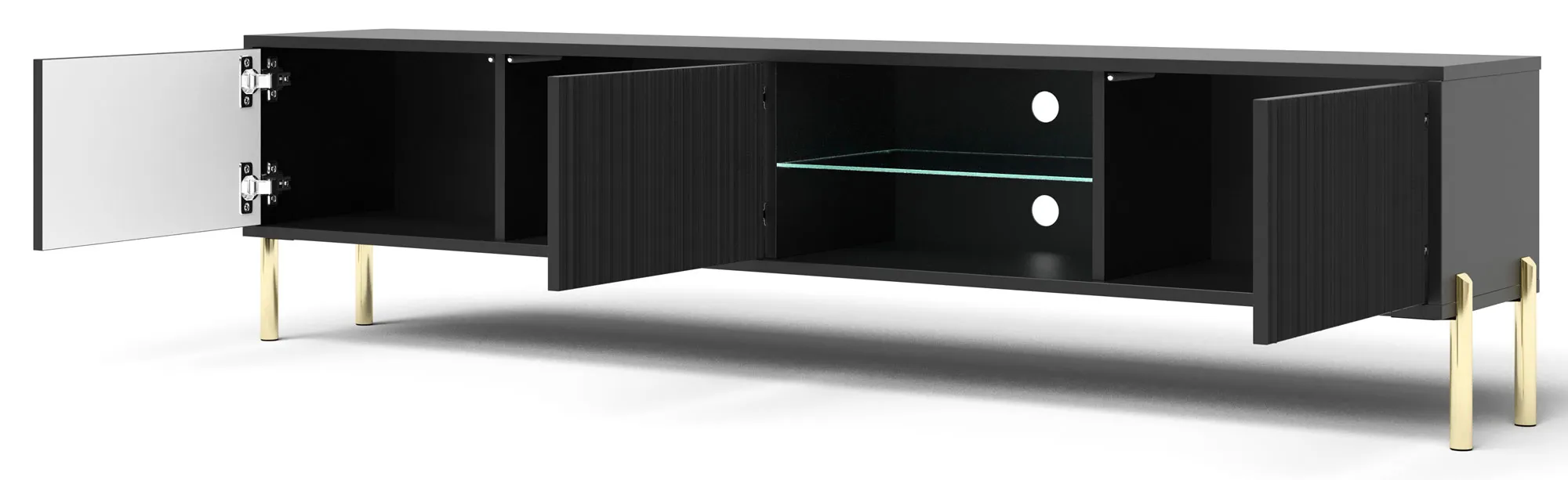 • Środkowa część z otwartą wnęką i półką z hartowanego szkła – idealna na dekoder, konsolę czy głośnik.