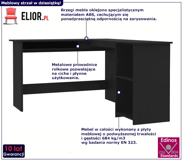 Wciąż wachasz się, czy to mebel dla Ciebie? Nie ma się nad czym zastanawiać! Jeżeli najważniejsza jest dla Ciebie jakość pracy, nowoczesne wnętrze, to biurko w kształcie litery L Lorenza 3X marki Edinos Premium rozwieje wszelkie Twoje wątpliwości. Zamawiając już dziś, skorzystasz z atrakcyjnej ceny 688 zł.