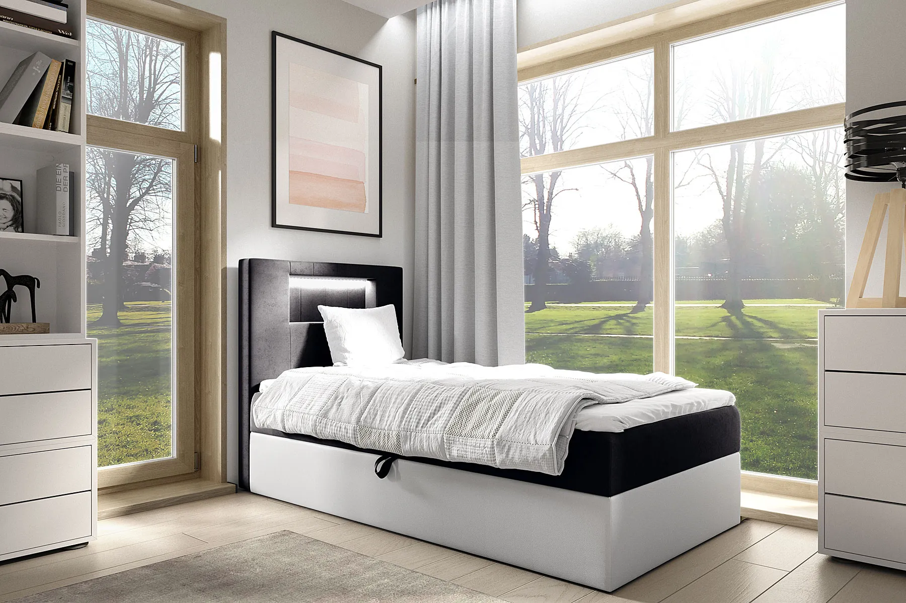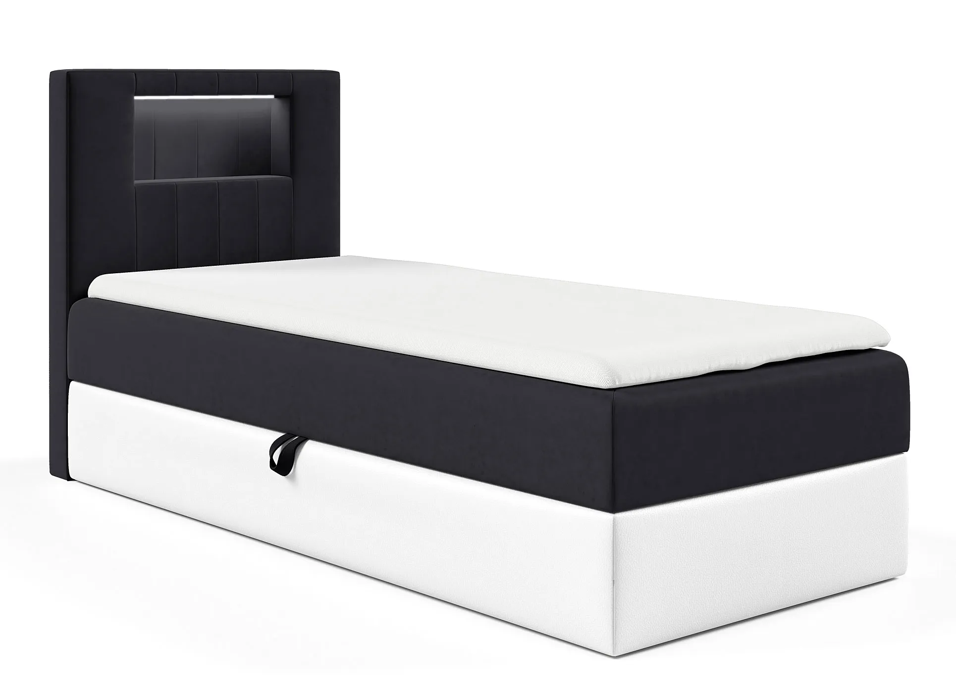 Łóżko Fenarro to nowoczesne i funkcjonalne rozwiązanie stworzone z myślą o codziennym komforcie. Prosta bryła i zagłówek z efektownym podświetleniem wprowadzają do wnętrza przyjemny nastrój i subtelny akcent nowoczesności. To pojedyncze łóżko idealnie sprawdzi się w pokoju młodzieżowym, gościnnym lub w niewielkiej sypialni, gdzie liczy się zarówno wygoda, jak i estetyka. Pod powierzchnią spania ukryty został pojemny schowek na pościel, który otwiera się lekko, dzięki automatowi na sprężynach. Możliwość wyboru strony otwierania pozwala dopasować mebel do układu wnętrza, a brak nóżek i zastosowanie ślizgów gwarantują stabilność i pełne dopasowanie do podłogi. Za wygodę odpowiada dwuwarstwowy system materacy – sprężynowy materac bonell zapewnia odpowiednie podparcie ciała, a topper z pianki T25 o wysokości 4 cm dodaje miękkości i podnosi komfort snu. Całość uzupełnia oświetlenie LED sterowane pilotem, które emituje chłodne, nastrojowe światło. To praktyczny detal, który podkreśla nowoczesny charakter łóżka i tworzy wyjątkowy klimat w pomieszczeniu.
