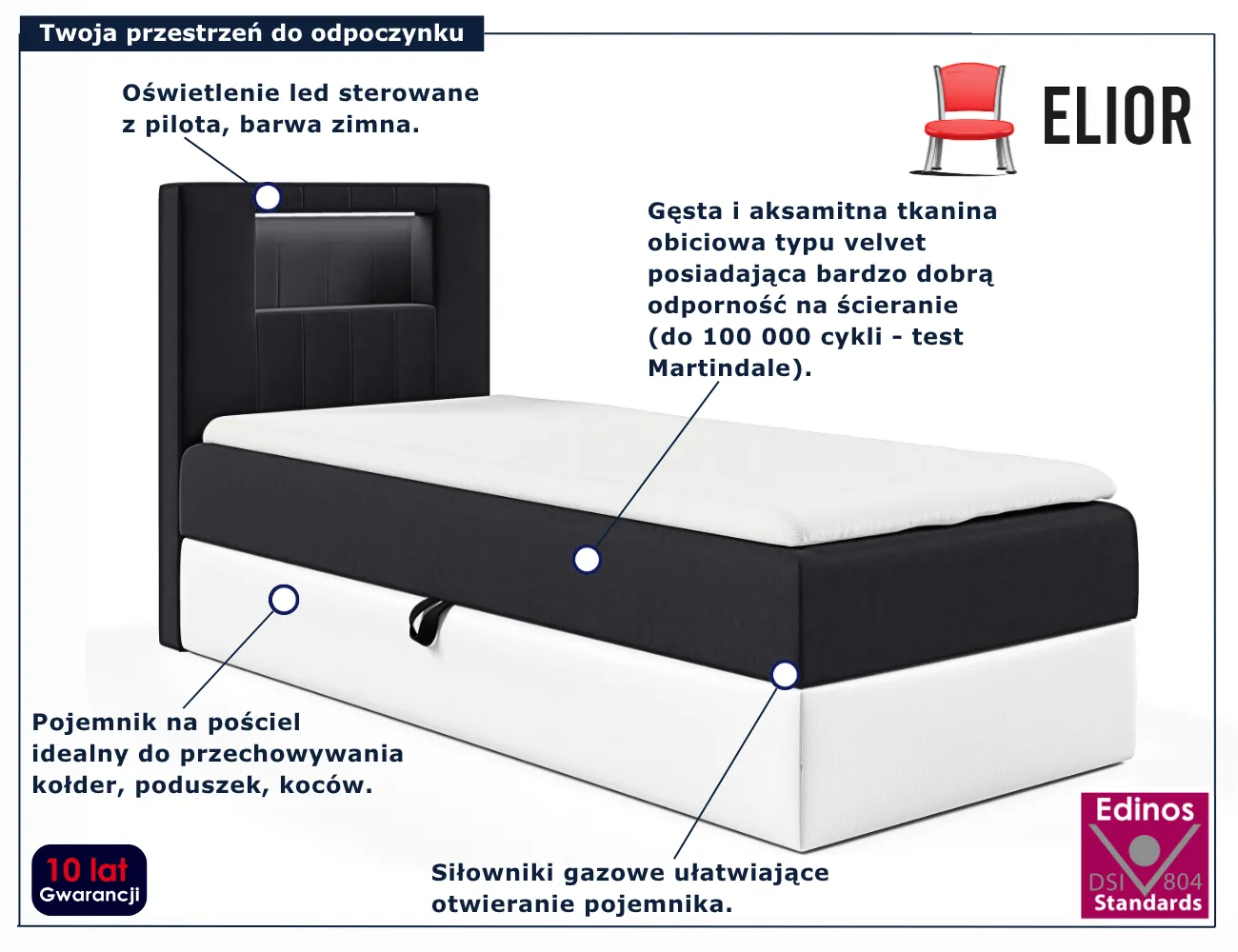 Łóżko pojedyncze Fenarro marki Edinos Premium to idealne połączenie funkcjonalności i estetyki. Zapewnia maksymalny komfort snu, a jednocześnie prezentuje się wyjątkowo stylowo. Wybierz Fenarro, jeśli szukasz mebla, który łączy w sobie wygodę, nowoczesny design i dopracowane detale.