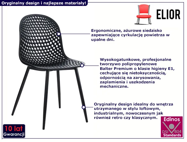 Krzesło Terma marki Edinos Premium to cudowne połączenie awangardowego designu z najwyższą jakością i starannością wykonania. Komfortowe oparcie o nietuzinkowej ażurowej formie pozwala na komfortowy wypoczynek oraz stanowi świetną ozdobę każdego salonu czy jadalni. Doskonale wyważona podstawa oraz stabilne, smukłe nóżki to gwarancja bezpiecznego użytkowania. Klasyczna czerń krzesła Terma nadaje mu charakteru i pozwala na idealne wpasowanie go do aktualnej aranżacji Twojego domu. Świetnie sprawdzi się zarówno w jadalni, salonie, domowym gabinecie, czy kawiarenki, którą właśnie otwierasz!