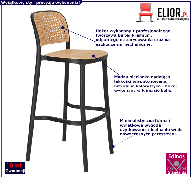 Do produkcji pięknego hokera boho Aldeo 2X wykorzystano poddany specjalistycznej obróbce, nowoczesny surowiec. Jest to profesjonalne, wysokogatunkowe tworzywo Balter Premium odporne na zarysowania, zabrudzenia i uszkodzenia mechaniczne. Tworzywo wykorzystane do produkcji hokera łatwo się czyści, co znacznie ułatwia jego codzienne użytkowanie. Stylowa plecionka nie tylko dodaje całości wizualnej lekkości, lecz także sprawia, że krzesło barowe posiada swobodną cyrkulację powietrza podczas jego użytkowania. Jakże to istotne, by meble, w które inwestujemy, cechowało wytrzymałe, staranne wykonanie. Na szczęście z fantastycznym stołkiem barowym Aldeo 2X nie trzeba się o to zupełnie martwić!