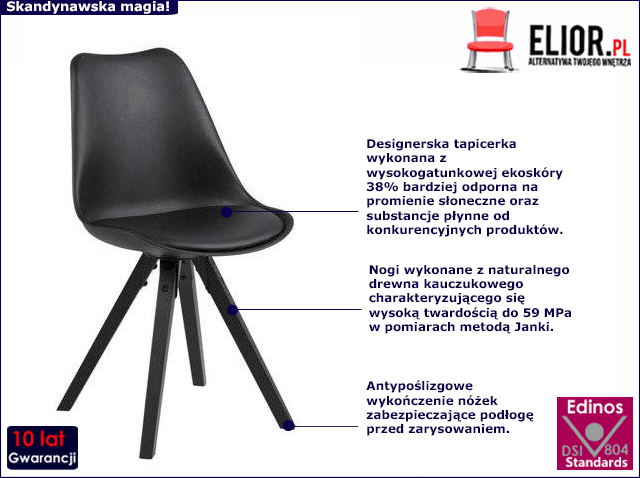 Designerska tapicerka siedziska to najwyższej jakości ekoskóra, łatwą do utrzymania w czystości (co jest szczególnie istotne w przypadku produktów wykorzystywanych podczas spożywania posiłków). Ekoskóra używana przy produkcji mebli marki Elior jest o wiele bardziej odporna na słońce oraz substancje płynne , co pozwala Ci na długie i bezpieczne użytkowanie. Plama po porannej kawie lub przyjęciu z czerwonym winem nie spowoduje już więcej konieczności wymiany tapicerki. Podstawa wykonana została z naturalnego drewna kauczukowego odznaczającego się wyjątkową trwałością i wysoką twardością do 59 MPa w pomiarach metodą Janki. Drewno kauczukowe charakteryzuje się jednolitym, jasnym usłojeniem i regularnym układem włókien, co w połączeniu z jego wysokimi parametrami jakościowymi tworzy doskonały materiał do wyrobu mebli. Ponadto nóżki krzesła zostały dodatkowo uszlachetnione o antypoślizgowe wykończenie chroniące podłogę przez zarysowaniami i uszkodzeniami mechanicznymi.