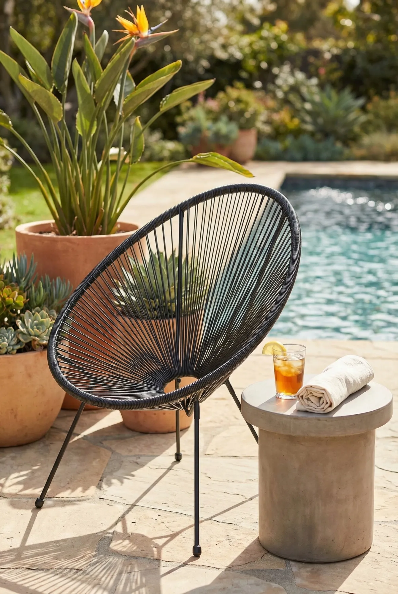 Ogród nowoczesny z wykorzystaniem czarnego krzesła Latios