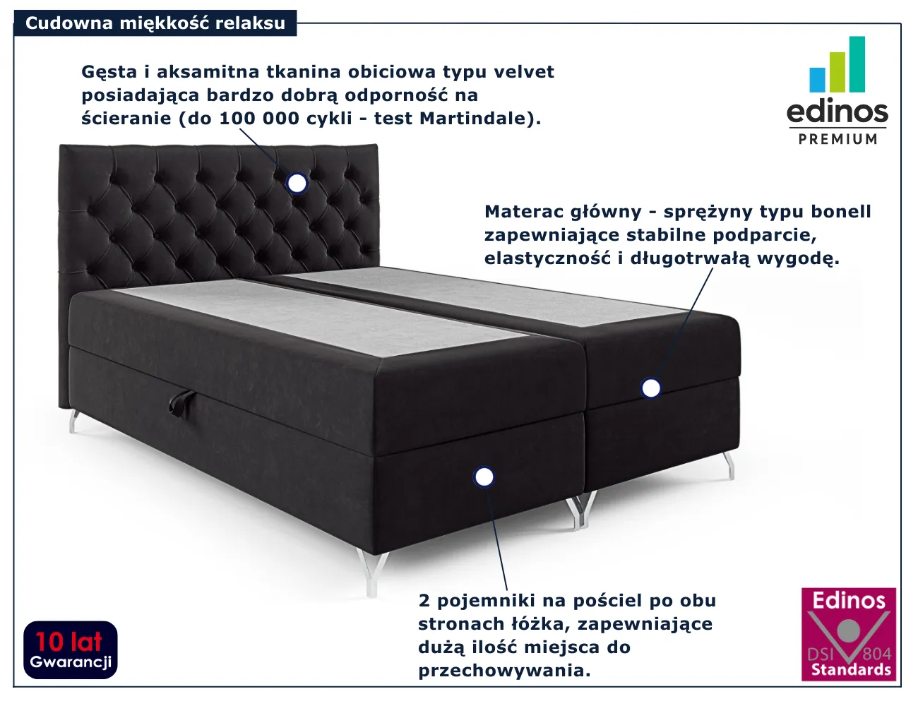Łóżko kontynentalne Lunavello 4X marki Edinos Premium to propozycja dla osób, które kochają połączenie subtelnego stylu glamour z ponadczasową wygodą. Jego efektownie pikowane zagłowie, zdobione guzikami tapicerowanymi tkaniną, od razu przyciąga wzrok i wprowadza do wnętrza nutę luksusu. Stabilna konstrukcja, dwa pojemne schowki na pościel oraz wygodne otwieranie dzięki sprężynowemu automatowi sprawiają, że Lunavello 4X jest nie tylko piękne, ale przede wszystkim funkcjonalne. Całość dopełniają eleganckie, srebrne nóżki, które dodają meblowi lekkości i klasy.