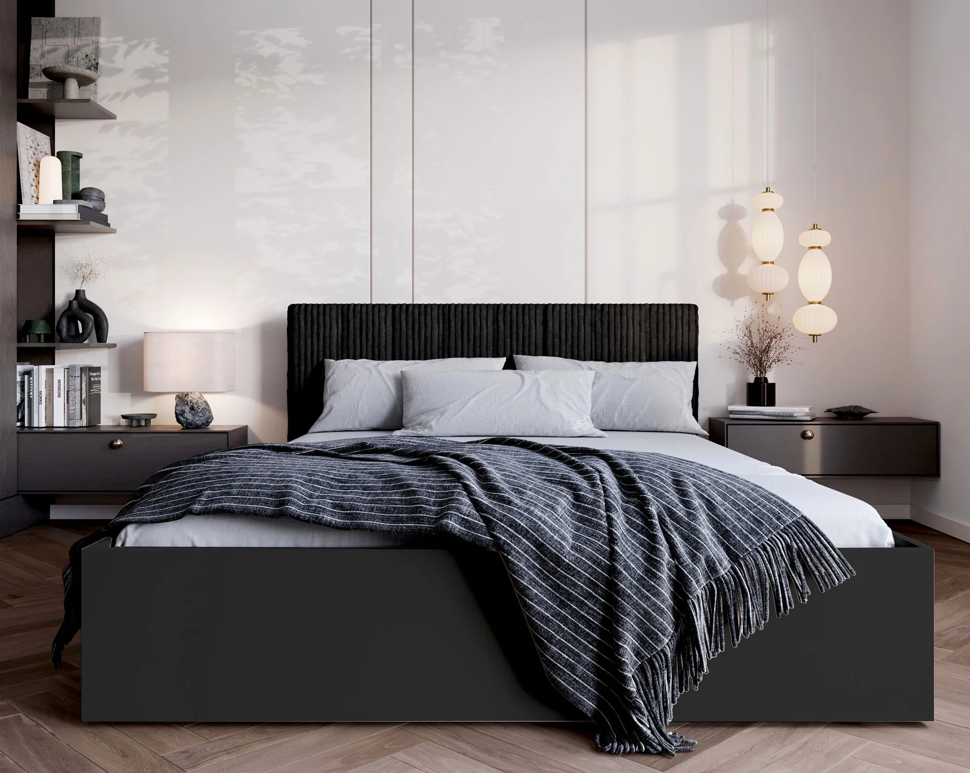 Sypialnia z wykorzystaniem czarnego łóżka ze sztruksowym zagłówkiem Werigio 4X