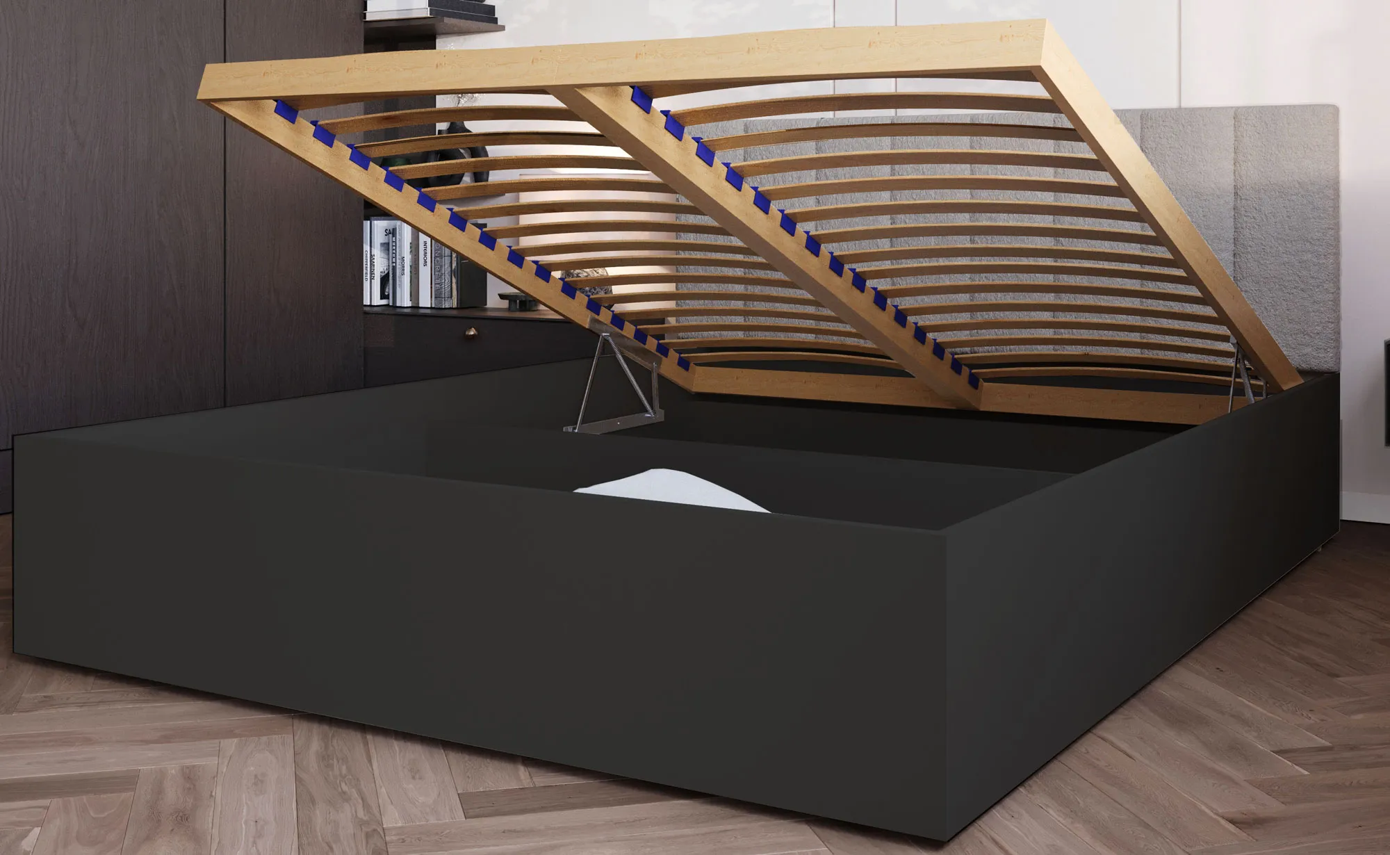 Pojemnik pod spodem ogromny, mieści całą zimową pościel, koce i walizki. Czarny welur na zagłówku wygląda elegancko i nie widać na nim drobnych plam. Siłowniki gazowe działają płynnie