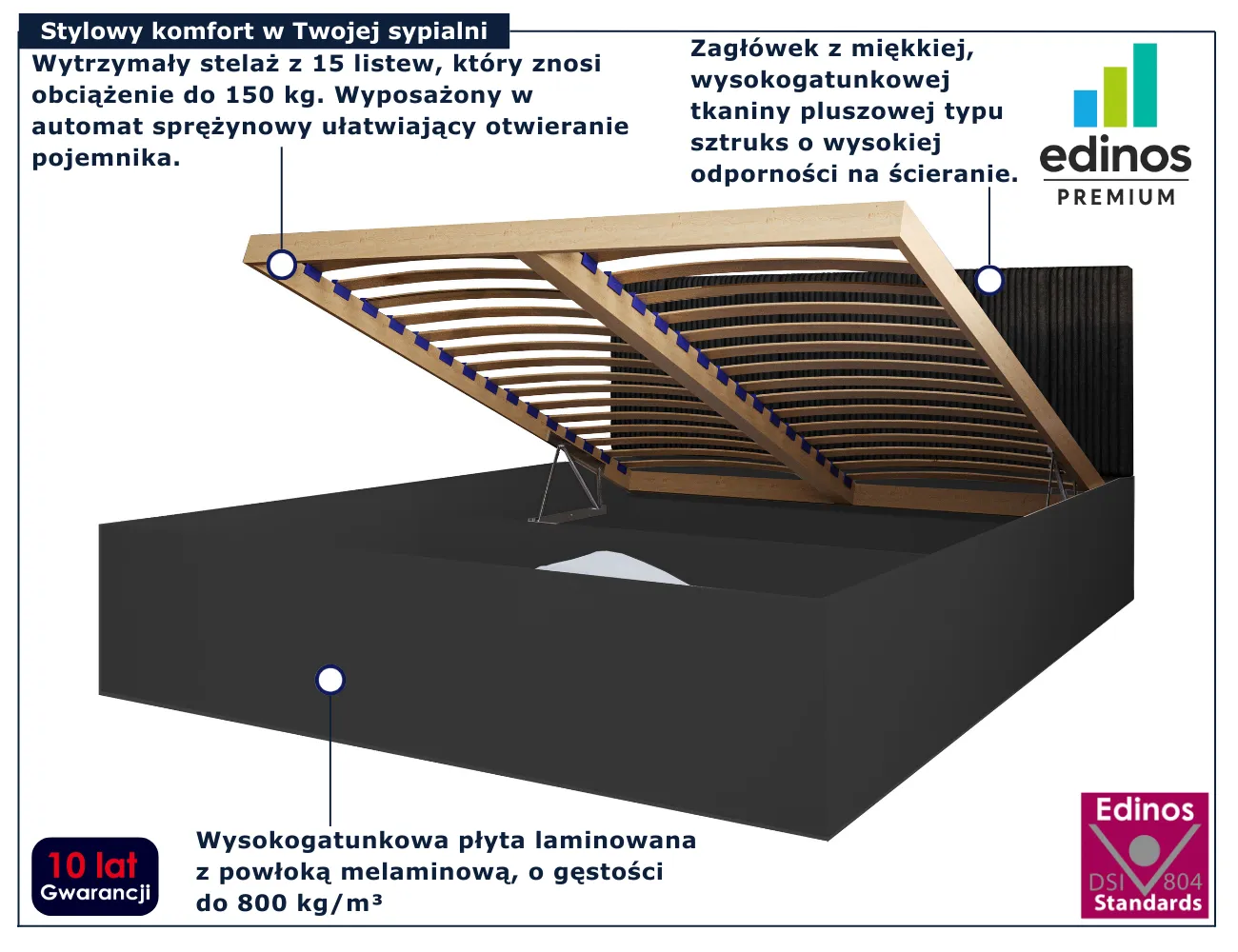 • Produkt posiada certyfikat jakości "Edinos Standards DSI 804", który potwierdza najwyższą jakość wykonania mebla oraz pełny stopień zgodności poszczególnych jednostek wytworzonego wyrobu z przyjętym wzorcem.