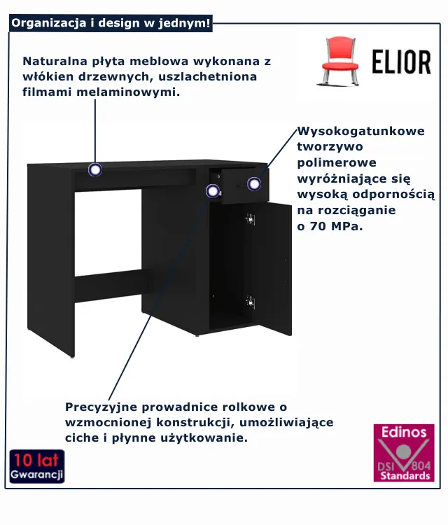 • 1 pojemna szuflada i 1 praktyczna szafka – idealne na dokumenty, akcesoria i inne niezbędne drobiazgi.