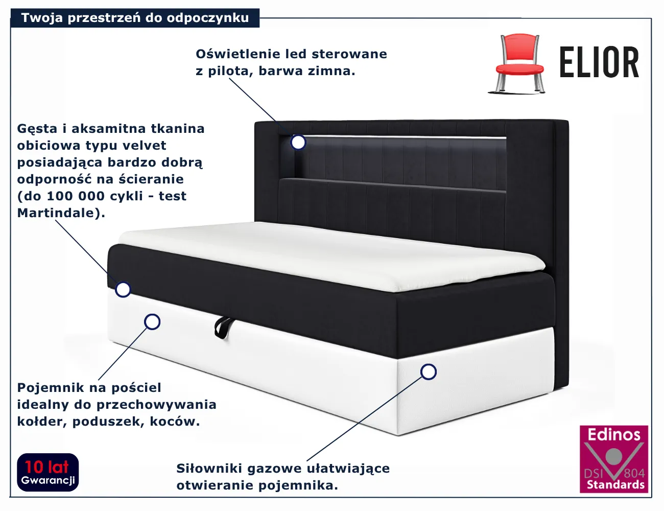 Łóżko pojedyncze Lorvani marki Edinos Premium to połączenie elegancji i funkcjonalności w najczystszej formie. Stylowe, praktyczne i wygodne – stworzone po to, by każda noc była przyjemnością, a każdy poranek zaczynał się z uśmiechem. Wybierz Lorvani i ciesz się komfortem w pięknym stylu każdego dnia!
