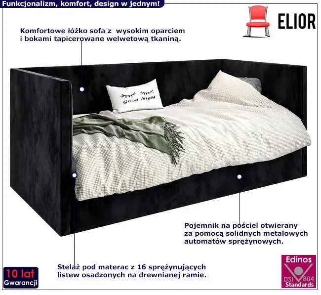 • Modny kolor: Czarny. Kliknij w link i sprawdź także inne łóżka tapicerowane z pojemnikiem w sklepie Edinos.pl. Stwórz swój praktyczny zestaw mebli.
