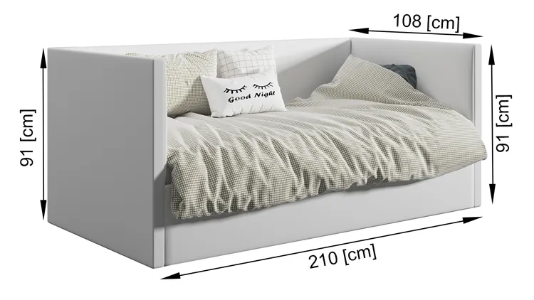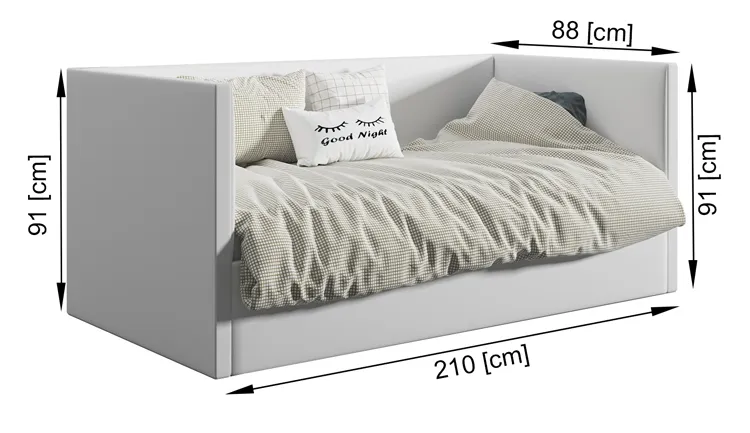 • Wymiary: wysokość całkowita: 91 cm, szerokość: 88 cm, długość: 210 cm.