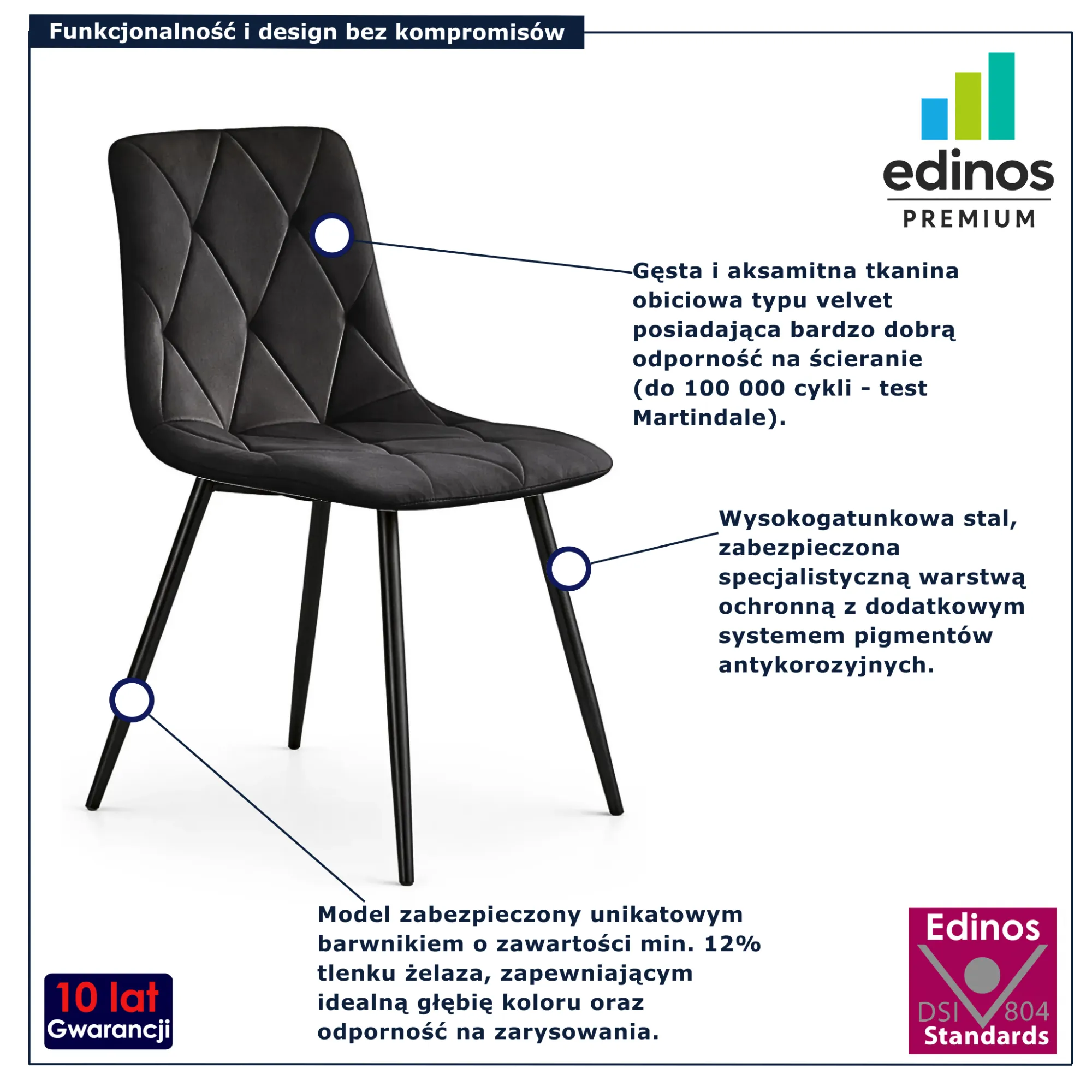 Krzesło Lumario marki Edinos Premium to połączenie subtelnej elegancji i nowoczesnej lekkości, które od razu przyciąga wzrok. Charakterystyczne pikowanie w romby nadaje mu wyrafinowanego, ponadczasowego charakteru, a jednocześnie sprawia, że wnętrze zyskuje głębię i strukturę. To model, który wygląda stylowo, ale nie jest przesadzony - ma w sobie dokładnie tyle elegancji, ile potrzeba. Miękka, welurowa tapicerka sprawia, że krzesło nie tylko świetnie się prezentuje, ale jest również wyjątkowo przyjemne w codziennym użytkowaniu. Wyprofilowane oparcie i komfortowe siedzisko zapewniają wygodę zarówno podczas rodzinnych posiłków, pracy przy biurku, jak i długich rozmów przy stole. Smukłe, metalowe nogi dodają konstrukcji lekkości i nowoczesnego charakteru, a przy tym gwarantują stabilność i trwałość. Lumario doskonale odnajdzie się w aranżacjach modern classic, nowoczesnych oraz modern glamour, ale dzięki swojej uniwersalnej formie z łatwością dopasuje się także do innych stylistyk.