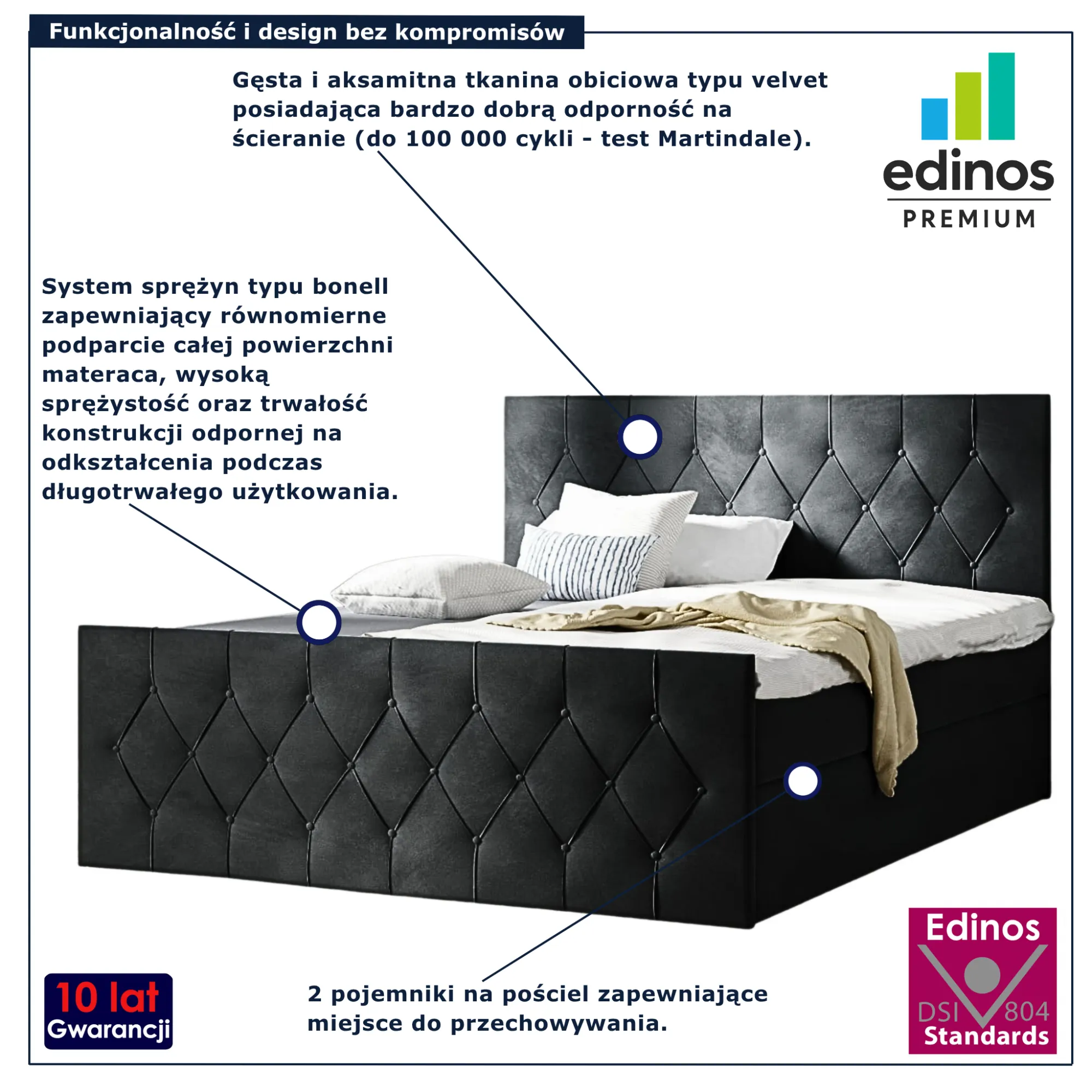• Produkt posiada certyfikat jakości "Edinos Standards DSI 804", który potwierdza najwyższą jakość wykonania mebla oraz pełny stopień zgodności poszczególnych jednostek wytworzonego wyrobu z przyjętym wzorcem.