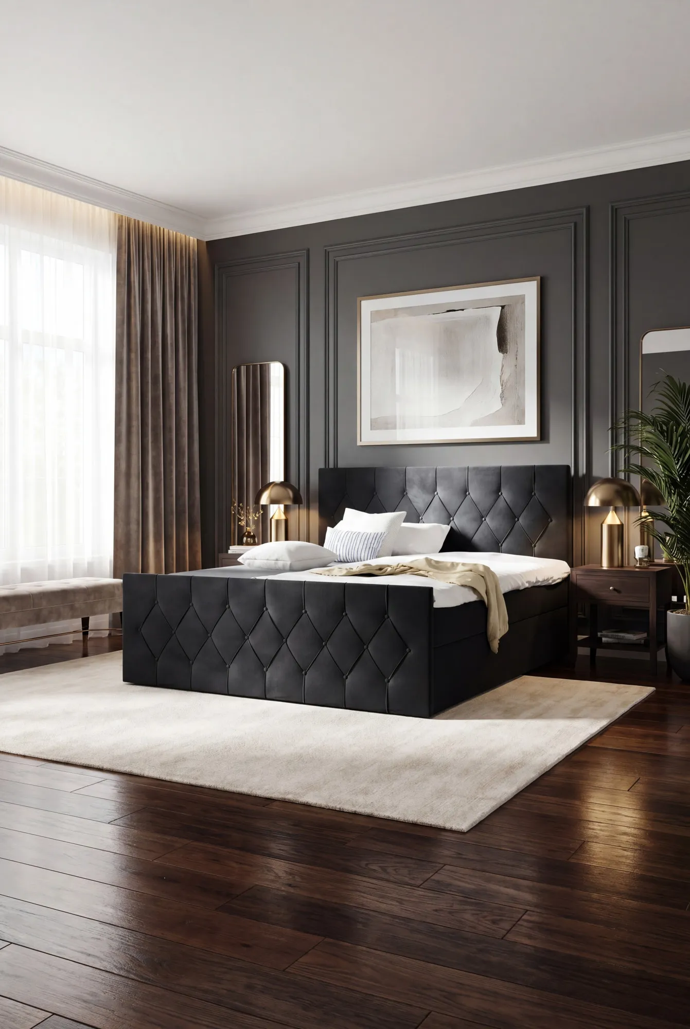 Aranżacja sypialni z czarnym łóżkiem kontynentalnym Omelisse
