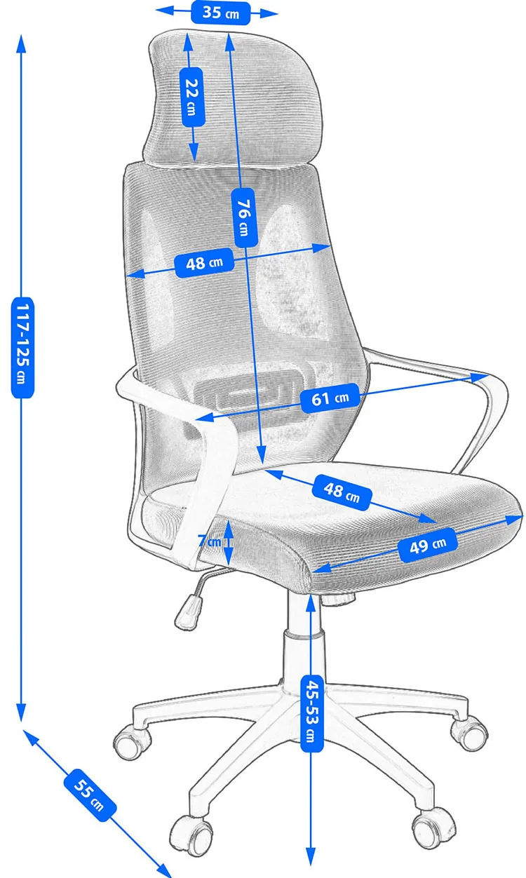 • Wymiary: wysokość mebla 117 - 125 cm; szerokość mebla 61 cm; głębokość mebla 55 cm; maksymalna wysokość siedziska 53 cm; minimalna wysokość siedziska 45 cm; szerokość siedziska 49 cm; głębokość siedziska 48 cm; obciążenie maksymalne 120 kg.