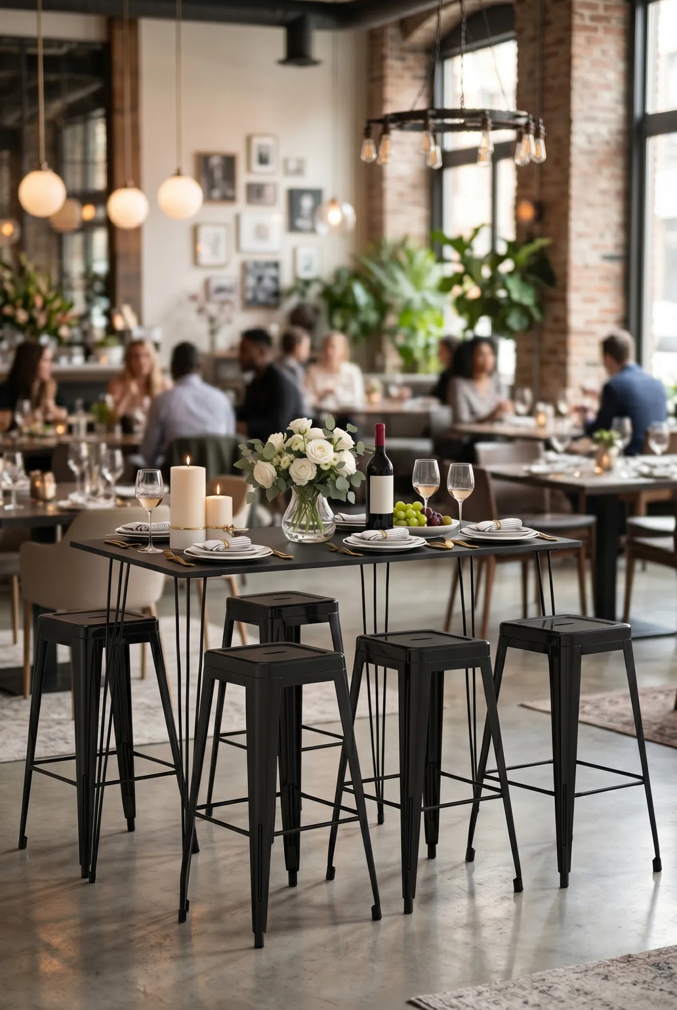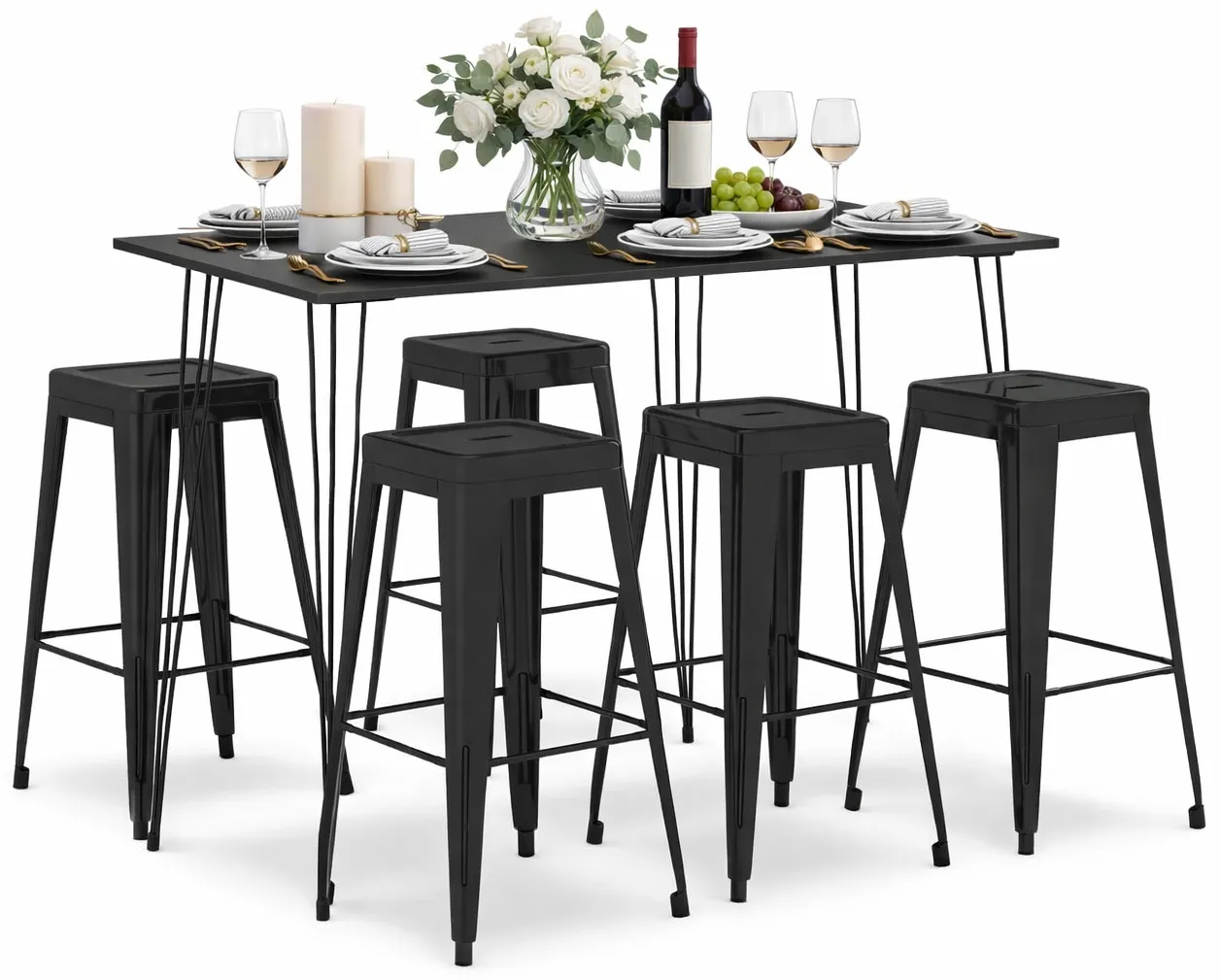 • Błyszczące czarne metalowe siedziska nadają kompletowi industrialnego, nowoczesnego charakteru.