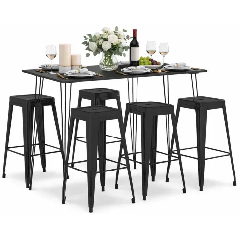 Pozostałe części zestawu barowego marki Edinos Premium to 4 stołki pubowe utrzymane w tym samym czarnym kolorze. Konstrukcje tych mebli wykonane zostały z najwyższej jakości metalu malowanego proszkowo odpornym na zarysowania i zadrapania. Ta technika zabezpieczania zapewnia dużą trwałość, odporność na korozję, chemikalia, wysoką temperaturę oraz uszkodzenia mechaniczne, dzięki czemu znacznie podnosi walory użytkowe i estetyczne mebli. Dodatkowo poprzeczki pod siedziskami i podnóżkami każdego ze stołków zostały wzmocnione, co zwiększa ich stabilność. Te meble barowe można też układać w stosy, co ułatwia ich przechowywanie i sprawdza się w przypadku ograniczonej przestrzeni.