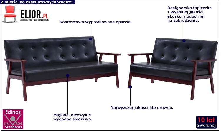 Ponieważ projektanci marki Edinos Premium mają pełną świadomość tego, że wybór mebli wypoczynkowych to inwestycja na lata podczas tworzenia mebli wypoczynkowych Garner 5S na pierwszym miejscu postawili na doskonałą jakość. Dzięki starannie wyselekcjonowanym materiałom wykorzystanym do ich produkcji oraz precyzyjnej pracy osiągnęli prawdziwy sukces. Meble te cieszą się doskonałym wykończeniem oraz długowiecznością. Designerska tapicerka w kolorze czerni pokryta została najwyższej jakości ekoskórą (skórą ekologiczną), łatwą do utrzymania w czystości (co jest szczególnie istotne w przypadku produktów wykorzystywanych podczas spożywania posiłków). Ekoskóra używana przy produkcji mebli marki Edinos Premium jest o wiele bardziej odporna na słońce oraz substancje płynne , co pozwala Ci na długie i bezpieczne użytkowanie. Plama po porannej kawie lub przyjęciu z czerwonym winem nie spowoduje już więcej konieczności wymiany tapicerki. Solidna konstrukcja sof to natomiast lite drewno charakteryzujące się wysoką gęstością na poziomie do 720 mg/m3 oraz wyjątkowo dużą twardością o wyniku do 98 MPa w pomiarach metodą Janki. To doskonałe połączenie sprawia, że wybierając wspaniały zestaw sof Garner 5S na długo zapomnisz o wymianie mebli na nowe. Postaw więc na wspaniały design idący w parze z doskonałą jakością jakiej nie znajdziesz u konkurencji!