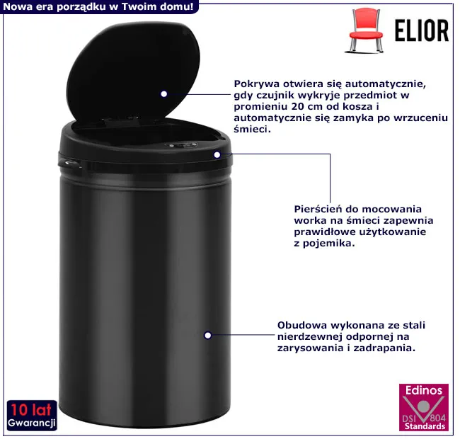 Dotyczy: Nowoczesny czarny śmietnik z automatyczną pokrywą 60L - Avis 6X