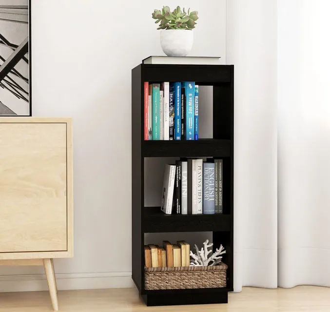 Drewniany czarny regał Osira 3X w nowoczesnym wnętrzu