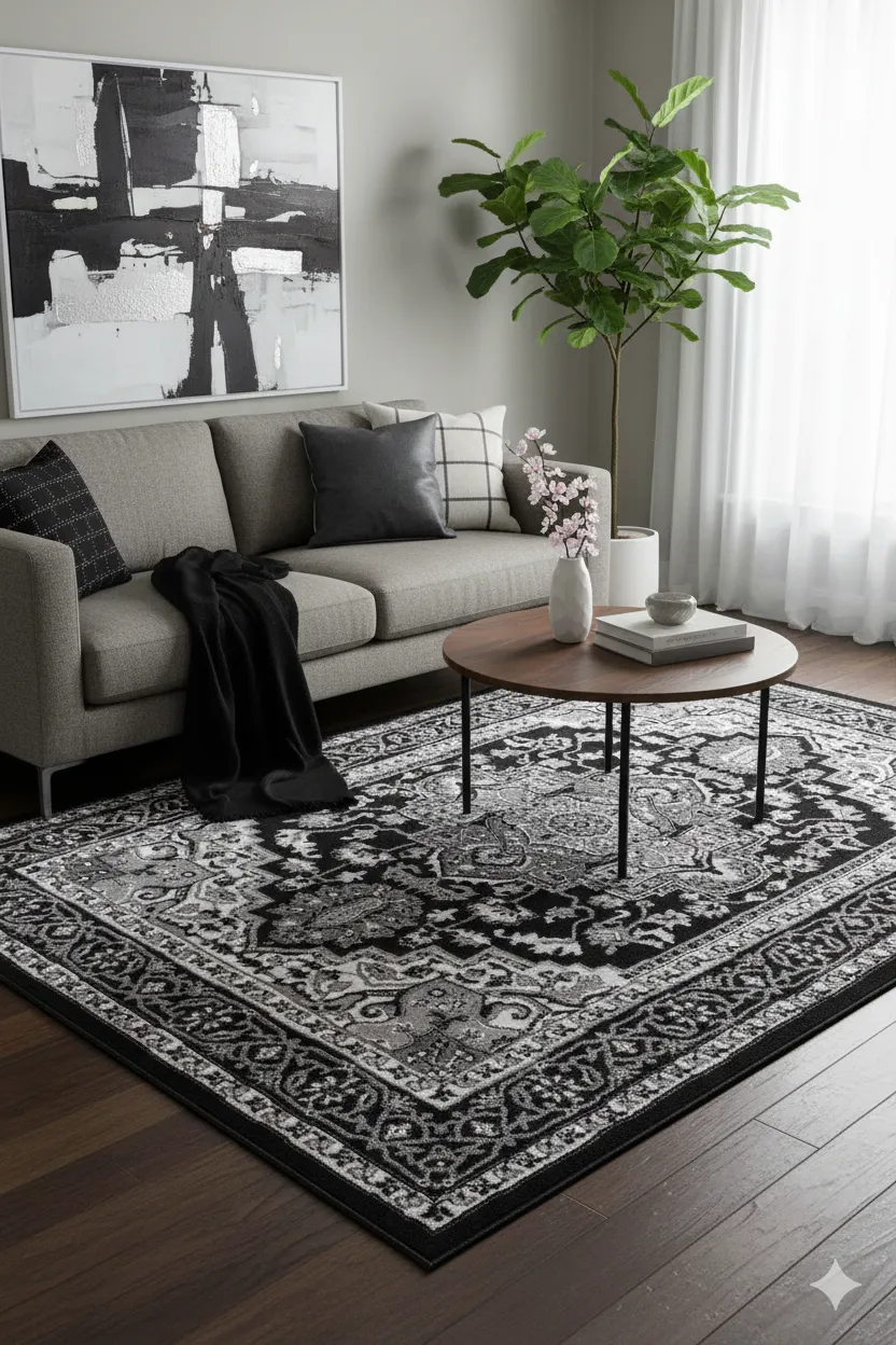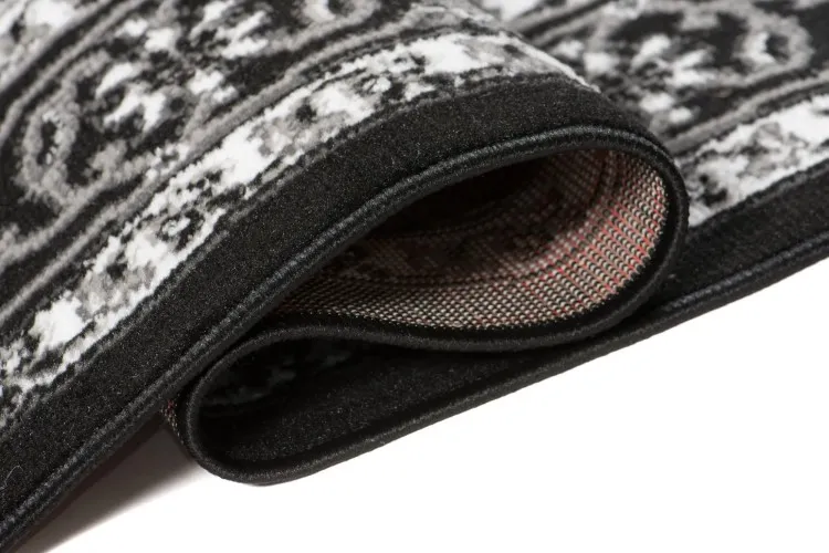 Dywan prezentuje się bardzo elegancko klasyczny wzór i głęboka czerń świetnie wpisują się w nowoczesne wnętrze. Materiał miękki, a dobrze leży na podłodze i nie przesuwa się. Estetyczny i praktyczny, no po prostu idealny do salonu.