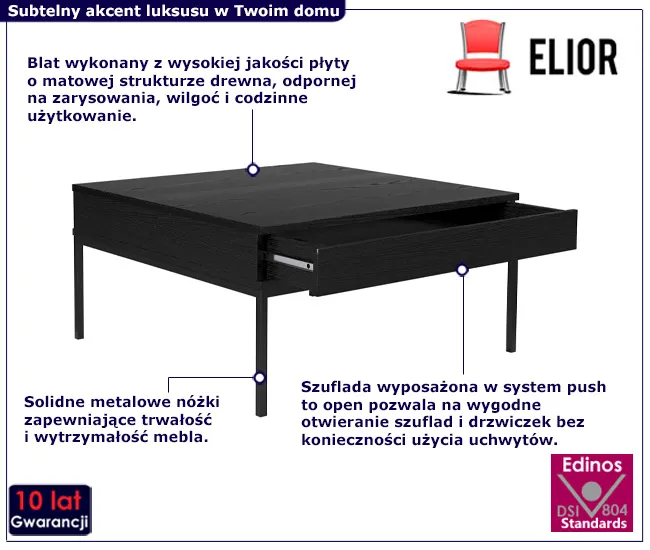 Jestem bardzo zadowolona z zakupu tego stolika. Metalowe nogi dodają lekkości, a czarny kolor wygląda elegancko w moim salonie. System push to open działa bez zarzutu, a szuflada pomieściła wszystkie drobiazgi. Idealny wybór dla osób ceniących minimalistyczny styl i funkcjonalność.
