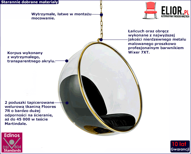 Tworząc fotel wiszący Flina 2X postawiliśmy sobie za cel zapewnienie najwyższej możliwej jakości, aby uzyskać wieloletnią trwałość bez obaw, że mebel może się łatwo zniszczyć, zmniejszając bezpieczeństwo użytkowania. Korpus wykonano z transparentnego akrylu. Akryl jest odpornym na wysoką temperaturę materiałem, który posiada bardzo dobrą wytrzymałość i odporność na uszkodzenia mechaniczne. Jest to materiał ekologiczny, co z pewnością jest ważną informacją jeśli dbanie o środowisko naturalne nie jest Ci obce. Nie każdy wie, że akryl ma w swej strukturze jony srebra, a co za tym idzie jest antybakteryjny. Wspomniane jony to składniki hamujące rozwój bakterii. Dodatkowo akryl jest wyjątkowo łatwy do utrzymania w czystości. Można go przecierać środkiem do polerowania szyb. Dwie wygodne poduszki stworzono z tkaniny welurowej Floores 7R - najwyższej jakości tkaniny obiciowej typu velvet z kolekcji francuskich welwetów marki Edinos Premium. Charakteryzuje się bardzo dużą odpornością na ścieranie, aż do 45 000 w teście Martindale oraz wysoką odpornością na działanie promieni słonecznych. Obręcz, wytrzymały łańcuch oraz kotwy wyprodukowano z najwyższej jakości nierdzewnego metalu malowanego proszkowo odpornym na zarysowania i zadrapania.