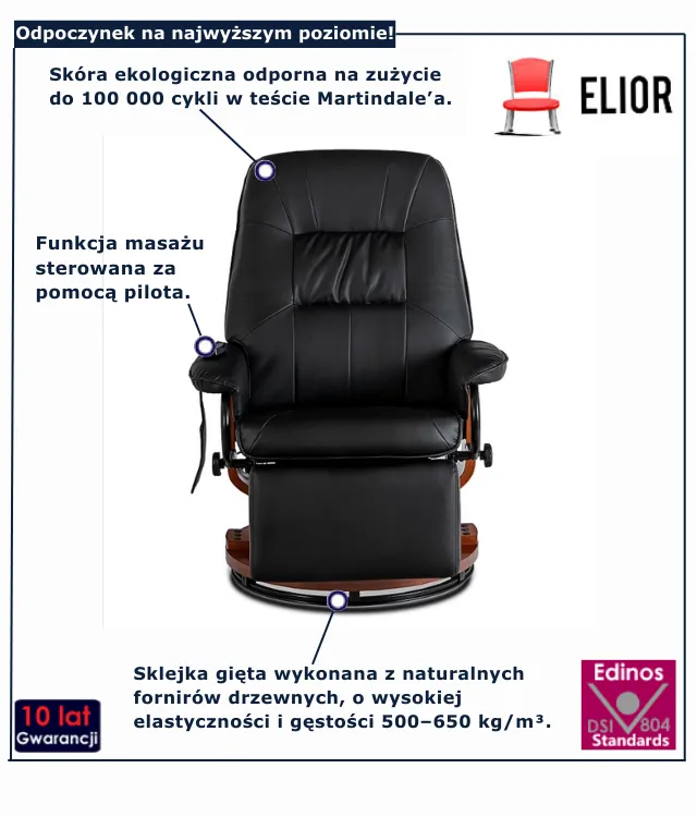 • Profesjonalna tapicerka ze skóry ekologicznej o wysokich parametrach technicznych - odporność na zużycie do 100 000 cykli w teście Martindale’a.