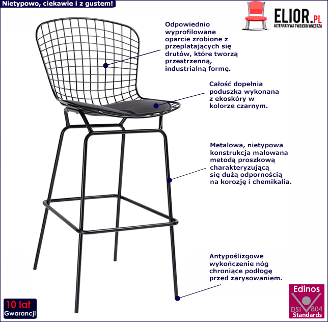 Konstrukcja mebla wykonana została z najwyższej jakości metalu/stali nierdzewnej pomalowanej proszkowo odpornym na zarysowania i zadrapania. Najwyższa jakość techniki metody natrysku proszkowego pozwoliła zaoferować firmie Elior aż 10 lat gwar. na swoje produkty. Technika malowania proszkowego charakteryzuje się dużą trwałością, odpornością na korozję, chemikalia, wysoką temperaturę oraz uszkodzenia mechaniczne, dzięki czemu znacznie podnosi walory użytkowe i estetyczne mebla. Designerska tapicerka została wykonana z najwyższej jakości skóry ekologicznej, łatwej do utrzymania w czystości (co jest szczególnie istotne w przypadku produktów wykorzystywanych podczas spożywania posiłków). Ekoskóra używana przy produkcji mebli marki Elior jest o wiele bardziej odporna na słońce oraz substancje płynne , co pozwala Ci na długie i bezpieczne użytkowanie. Plama po porannej kawie lub przyjęciu z czerwonym winem nie spowoduje już więcej konieczności wymiany tapicerki. Ponadto metalowe nogi hokera zostały udoskonalone w antypoślizgowe wykończenie, w trosce o bezpieczeństwo Twoje i Twoich podłóg! Bez obaw możesz korzystać z mebla w dowolnej pozycji, wykończenia te zapewnią Ci stabilność i równowagę, a także ochronę przed zarysowaniami i uszkodzeniami mechanicznymi powierzchni Twojego domu.