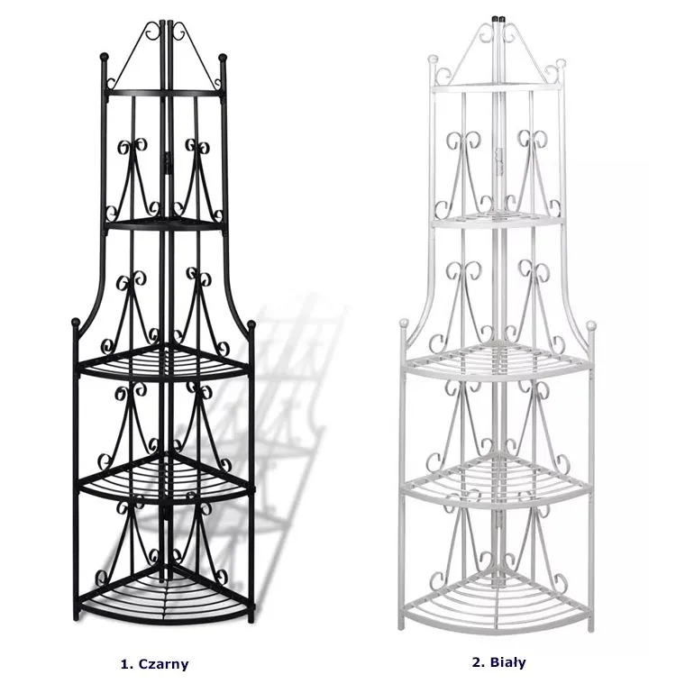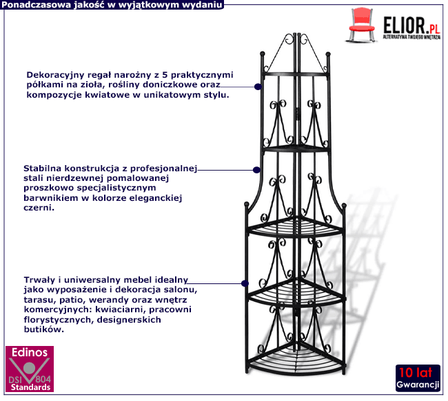 Narożny stojak na kwiaty Avir marki Edinos Premium to najnowszy pomysł marki Edinos Premium na oryginalną dekorację wnętrza dla wszystkich amatorów roślin, hodowców ziół, miłośników kwiatów oraz wielbicieli unikatowych mebli w romantycznym stylu. Regał Avir został zaprojektowany z dużą dozą artystycznego smaku, w formie klasycznej etażerki w nietypowym, metalowym wydaniu. Pięć komfortowych, odpowiednio szerokich półek daje wystarczająco dużo miejsca na doniczki z kwiatami, ziołami i kompozycjami roślin sezonowych. Stabilna konstrukcja z nierdzewnej stali w kolorze ponadczasowej czerni została kunsztownie ozdobiona subtelną ornamentyką z detalami w kształcie róż. Tak wykonany regał kwiatowy Avir będzie nie tylko wyjątkowo praktycznym kwietnikiem, ale także fenomenalną ozdobą każdego wnętrza. Avir to doskonała propozycja do salonu, czy pokoju dziennego, a nawet sypialni, która nie tylko świetnie wystylizuje wnętrze, ale stworzy idealną dekorację z wykorzystaniem domowych roślin. Avir sprawdzi się także jako funkcjonalny i niezwykle efektowny kwietnik na werandzie, w oranżerii i oczywiście w kwiaciarni. A to przecież nie koniec niesamowitych możliwości aranżacyjnych tego unikatowego mebla! Avir doskonale poradzi sobie w roli romantycznego regału na książki i bibeloty, w łazience zastąpi tradycyjne szafki i wspaniale wyeksponuje flakony z kosmetykami, a zwyczajną kuchnię zamieni w bajeczną przestrzeń pełną zapachu świeżych ziół i książek kucharskich. Zaczaruj swoje wnętrze z niesamowitym kwietnikiem Avir marki Edinos Premium!
