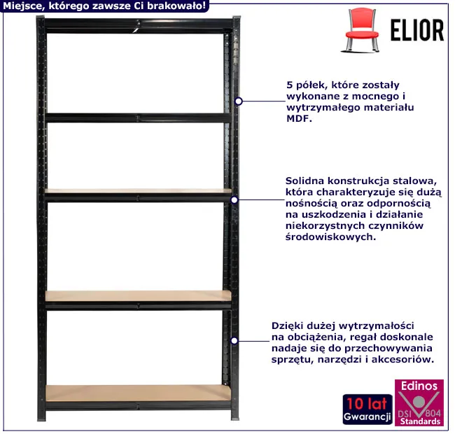 • Wysokiej jakości metal odporny na zarysowania, zadrapania oraz korozję, co przekłada się na długą żywotność i estetyczny wygląd regału.