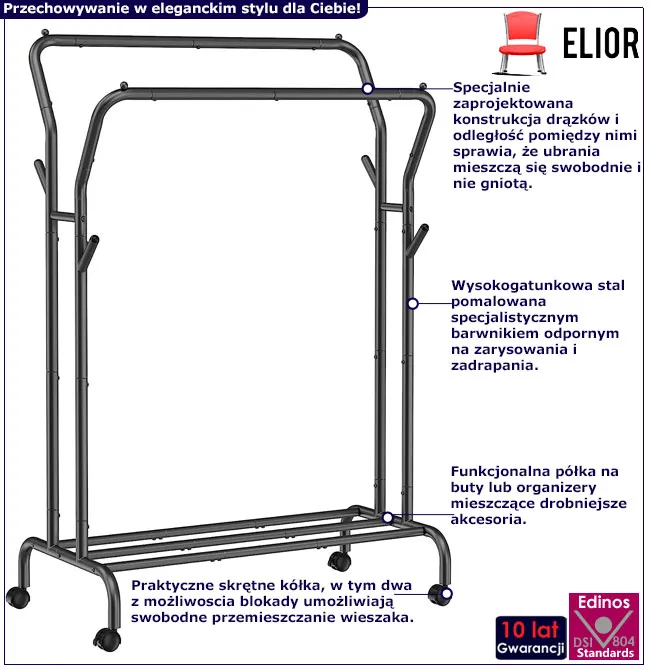 • Kliknij w link i sprawdź także inne wieszaki na kółkach na ubrania w sklepie Edinos.pl.