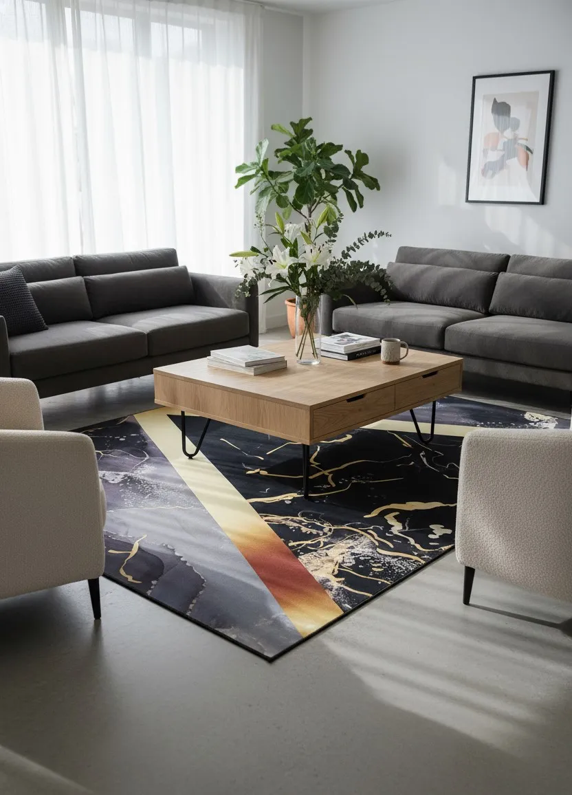 Dywan prezentuje się bardzo efektownie czarna baza i złote wzory tworzą elegancki, nowoczesny akcent w salonie. Materiał jest przyjemny w dotyku, a wzór nie blaknie po kilku tygodniach od zakupu. Dywan dobrze leży na podłodze i nie przesuwa się. Ja polecam.
