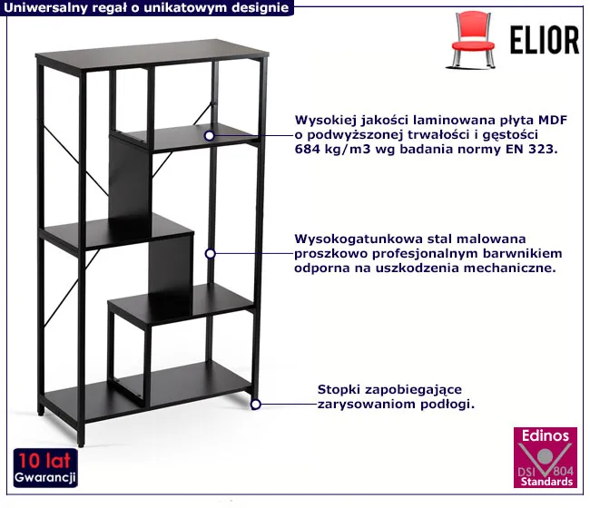 • półki wykonane z trwałej, laminowanej płyty MDF o podwyższonej trwałości i gęstości