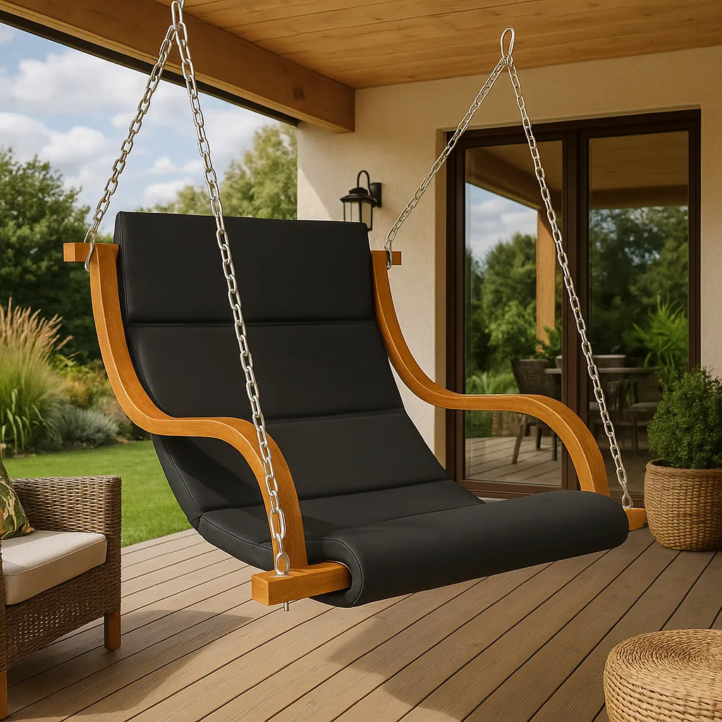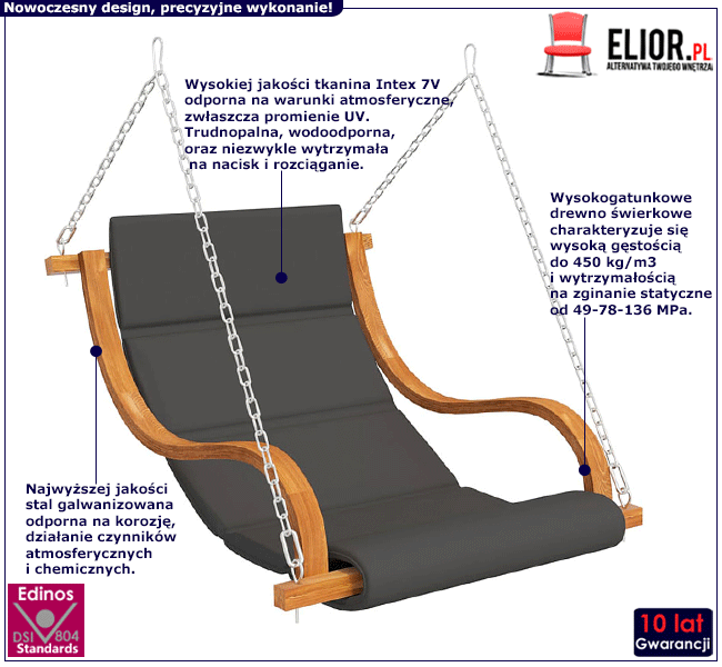 Ekstremalne przygody nie są dla Ciebie? Wolisz spokojne chwile w zaciszu, dlatego planujesz stworzyć w swoim ogrodzie miejsce w którym beztrosko oddasz się wypoczynkowi? Nie mogłeś lepiej trafić! Nowoczesny fotel wiszący Domino to projekt o wyjątkowym charakterze. Połączenie naturalnego drewna oraz tapicerki w kolorze czerni tworzy całość robiącą niesamowite wrażenie. Ergonomiczne, starannie wyprofilowane siedzisko podpiera w odpowiedni sposób kręgosłup, a drewniane, delikatnie zakrzywione podłokietniki pozwalają na komfortowe oparcie ramion. Wyróżniający się prostymi liniami fotel Domino wpisuje się w aktualne trendy i doskonale dopasowuje się do nowoczesnych aranżacji. Świetnie odnajdzie się zarówno w ogrodzie w towarzystwie drzew, jak i na tarasie. Dzięki mocnym łańcuchom dołączonym do zestawu fotel jest w pełni bezpieczny. Tapicerka wykonana z wysokogatunkowej tkaniny jest łatwa do utrzymania w czystości, co znacznie podnosi komfort użytkowania fotela. Stwórz raj w nowoczesnym stylu i ciesz się magiczną chwilą tylko dla siebie!