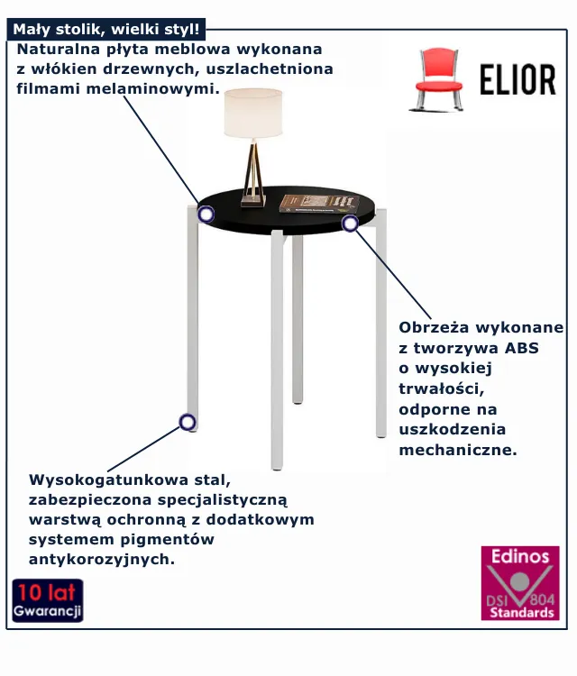 • Produkt posiada certyfikat jakości "Edinos Standards DSI 804", który potwierdza najwyższą jakość wykonania mebla oraz pełny stopień zgodności poszczególnych jednostek wytworzonego wyrobu z przyjętym wzorcem.