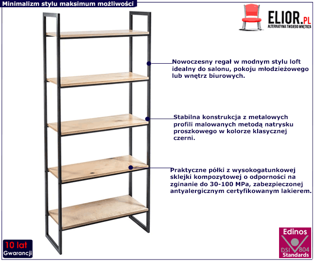 Minimalistyczny regał Maso 10X marki Elior to nowoczesny projekt dedykowany miłośnikom niesztampowego designu, minimalizmu aranżacyjnego i ponadczasowej jakości. Konstrukcja regału Maso 10X powstała z najwyższej jakości metalu pomalowanego proszkowo profesjonalnym barwnikiem w odcieniu klasycznej czerni. Najwyższa jakość techniki metody natrysku proszkowego pozwoliła zaoferować firmie Elior aż 10 lat gwarancji na swoje produkty. Technika malowania proszkowego charakteryzuje się dużą trwałością, odpornością na korozję, chemikalia, wysoką temperaturę oraz uszkodzenia mechaniczne, dzięki czemu znacznie podnosi walory użytkowe i estetyczne mebla. Regał Maso 10X został wyposażony w 5 praktycznych półek z naturalnej sklejki kompozytowej zbudowanej z krzyżujących się cienkich warstw drewna (obłogów). Dla zwiększonej trwałości sklejka składa się z nieparzystej liczby obłogów, dzięki czemu jest niezwykle elastyczna, daje się łatwo modelować, charakteryzuje się ponadprzeciętną trwałością i odpornością na zginanie do 30-100 MPa ( według normy PN-EN 310). Półki o grubości 18 mm zostały przykręcone do metalowych profili specjalistycznymi metalowymi śrubami, dzięki czemu są wyjątkowo stabilne i wytrzymałe na nacisk. Dla podniesienia jakości i walorów estetycznych półki zostały precyzyjnie zabezpieczone certyfikowanym lakierem o właściwościach antystatycznych i hipoalergicznych. Tak wykonany regał Maso 10X marki Elior to kwintesencja doskonałej jakości i gwarancja wieloletniej trwałości.