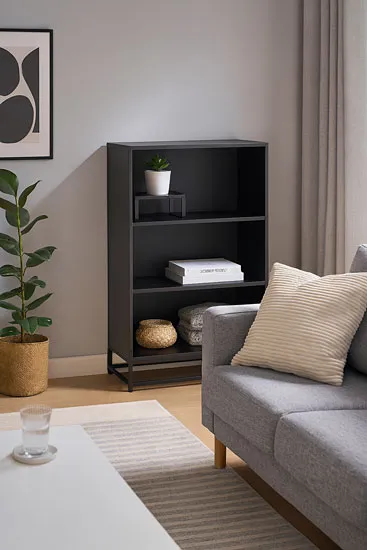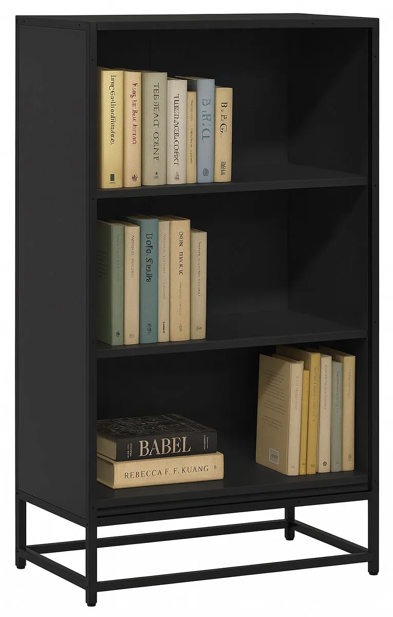 Regał wygląda nowocześnie i minimalistycznie. Czarny kolor jest głęboki i matowy, dzięki czemu dobrze komponuje się z innymi meblami. Półki są solidne i bez problemu utrzymują książki. Montaż prosty, a wszystkie elementy były dobrze dopasowane.
