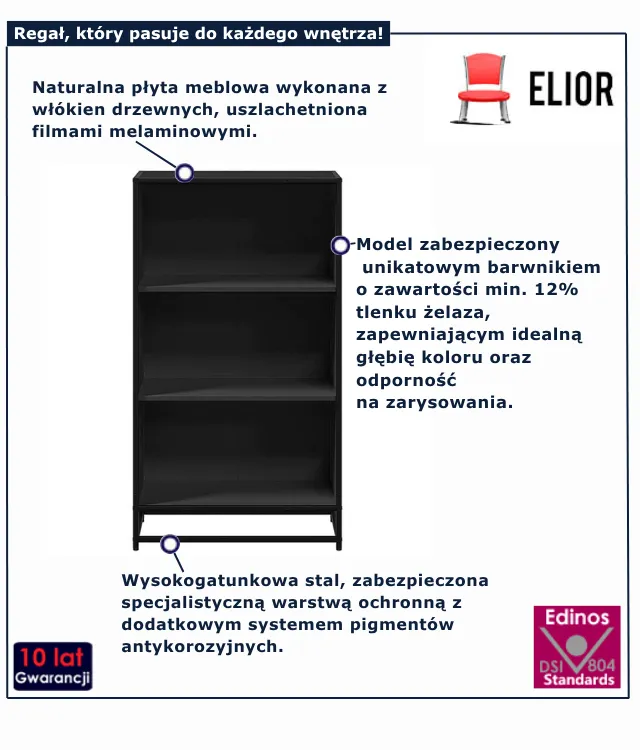 Szukasz eleganckiego mebla, który pozwoli Ci uporządkować książki i jednocześnie nada wnętrzu wyjątkowy charakter? Czarny regał na książki Shevo 4X marki Edinos Premium to połączenie stylu, funkcjonalności i nowoczesnego designu. Jego prosta forma i głęboki, matowy kolor tworzą idealne tło dla ulubionych tytułów, rodzinnych pamiątek i drobnych dekoracji. Każda półka to miejsce na wspomnienia, wiedzę i inspiracje, które codziennie budują Twoją przestrzeń. Ten czarny regał to nie tylko praktyczny mebel – to wyraz dobrego smaku i zamiłowania do harmonii. Z Shevo 4X Twoja domowa biblioteczka zyska elegancki porządek i ponadczasowy styl.
