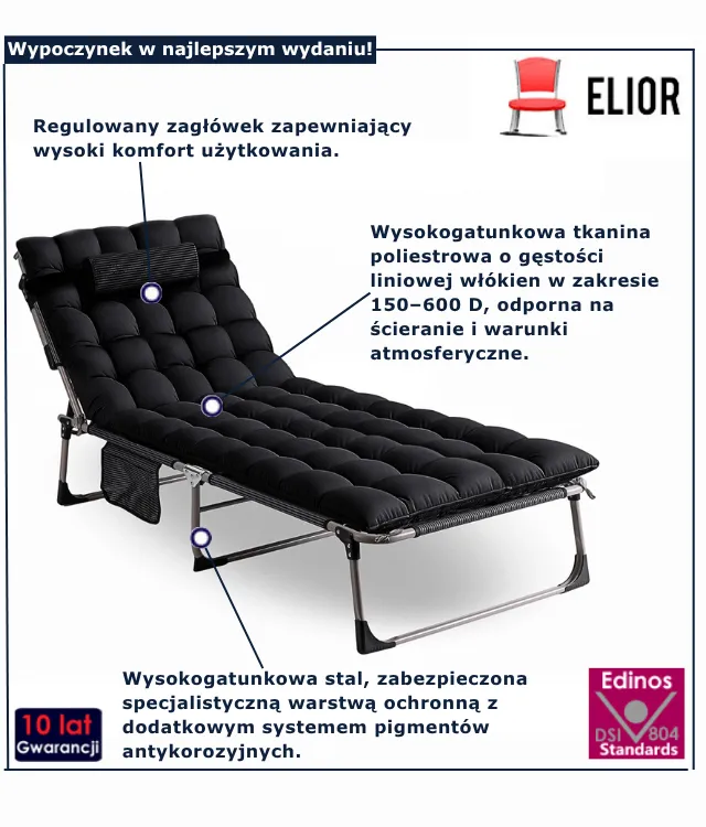 Produkt spełnił moje oczekiwania w 100%! Leżak jest solidny, wykonany z trwałych materiałów, a jego czarny kolor świetnie komponuje się z resztą ogrodowego wyposażenia. Co najważniejsze, można go łatwo złożyć i przechowywać, co jest dużym plusem, gdy nie korzystam z niego na co dzień. Polecam wszystkim, którzy cenią komfort i praktyczność!