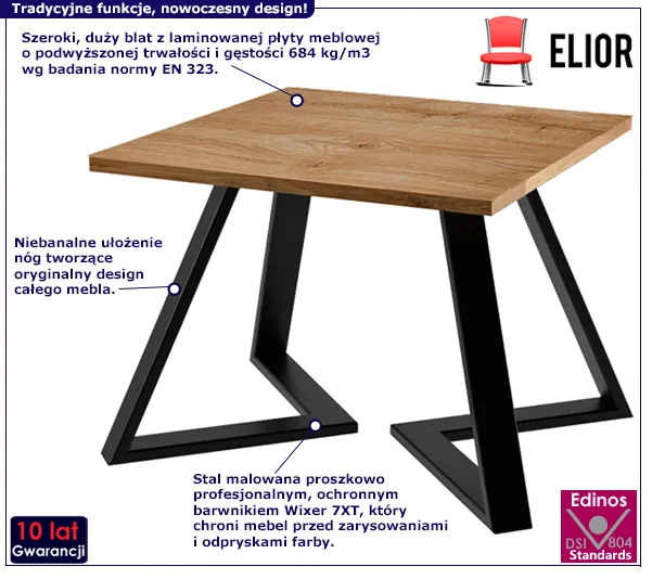 Jednym z najczęstszych błędów popełnianych w trakcie meblowania salonu jest aranżowanie go w przewidywalny i dobrze znany nam już sposób. Niechętnie sięgamy po ekstrawaganckie dodatki, wybierając proste, uniwersalne kanapy, czy stoły. To błąd! Geometryczne meble nie tylko przykuwają uwagę: mogą także zmienić postrzeganie przestrzeni salonu, optycznie ją powiększając. Chcesz ożywić wnętrza, wprowadzając do nich coś nowego, ale jednocześnie blisko Ci do minimalizmu i ponadczasowej klasyki? Stolik Matella ZX marki Elior to rozwiązanie, które łączy w sobie kompromis. Ciepła kolorystyka blatu nie znudzi się wraz z upływającym czasem. Idealnie wkomponuje się w każdą aranżację: od skandynawskiego akcentu, po romantyczne wnętrza boho, do salonów urządzonych w klasycznym wydaniu. Silnie zaznaczona geometria podstawy stolika przełamie prostotę mebla: nieregularny, nieco przekorny rozstaw nóżek powiększy Twój salon, wpływając na poczucie przestrzenności i harmonii. Takie industrialne uzupełnienie klasycznego blatu stolika będzie najbardziej niecharakterystycznym elementem wystroju w Twoim domu, wzbudzając zachwyt i uznanie Twoich gości!