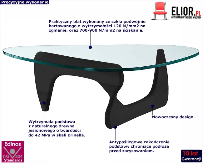 - Materiał: szkło podwójnie hartowane o 5-7 krotnie wyższej wytrzymałości mechanicznej od zwykłego szkła, naturalne, twarde drewno jesionowe o twardości do 42 MPa w skali Brinella.