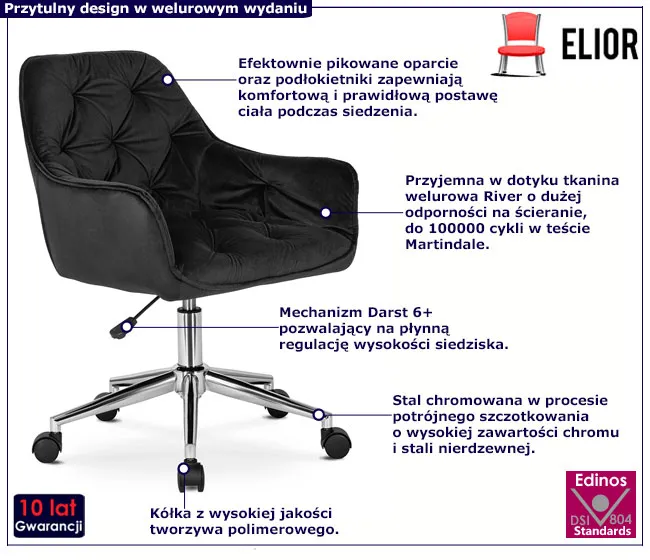 • Materiał: welurowa tapicerka River, stal chromowana, tworzywo polimerowe, pianka tapicerska.