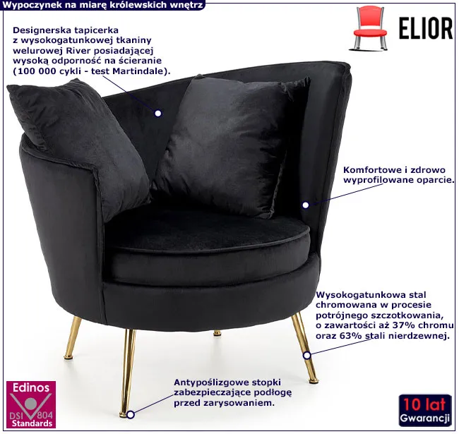 • Kolor: Tapicerka w kolorze czarnym, nóżki złote. Sprawdź także inne fotele glamour w sklepie Edinos.pl. Stwórz swój praktyczny zestaw mebli.