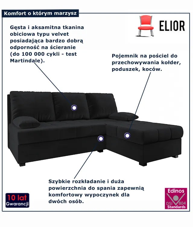Zamówienie dotarło bez uszkodzeń i we właściwym dniu. Materiał welurowy prezentuje się bardzo dobrze, a czarny kolor dodaje wnętrzu elegancji. Siedzisko jest miękkie, a cała konstrukcja stabilna. Narożnik wygląda solidnie i dobrze komponuje się z innymi meblami w salonie.