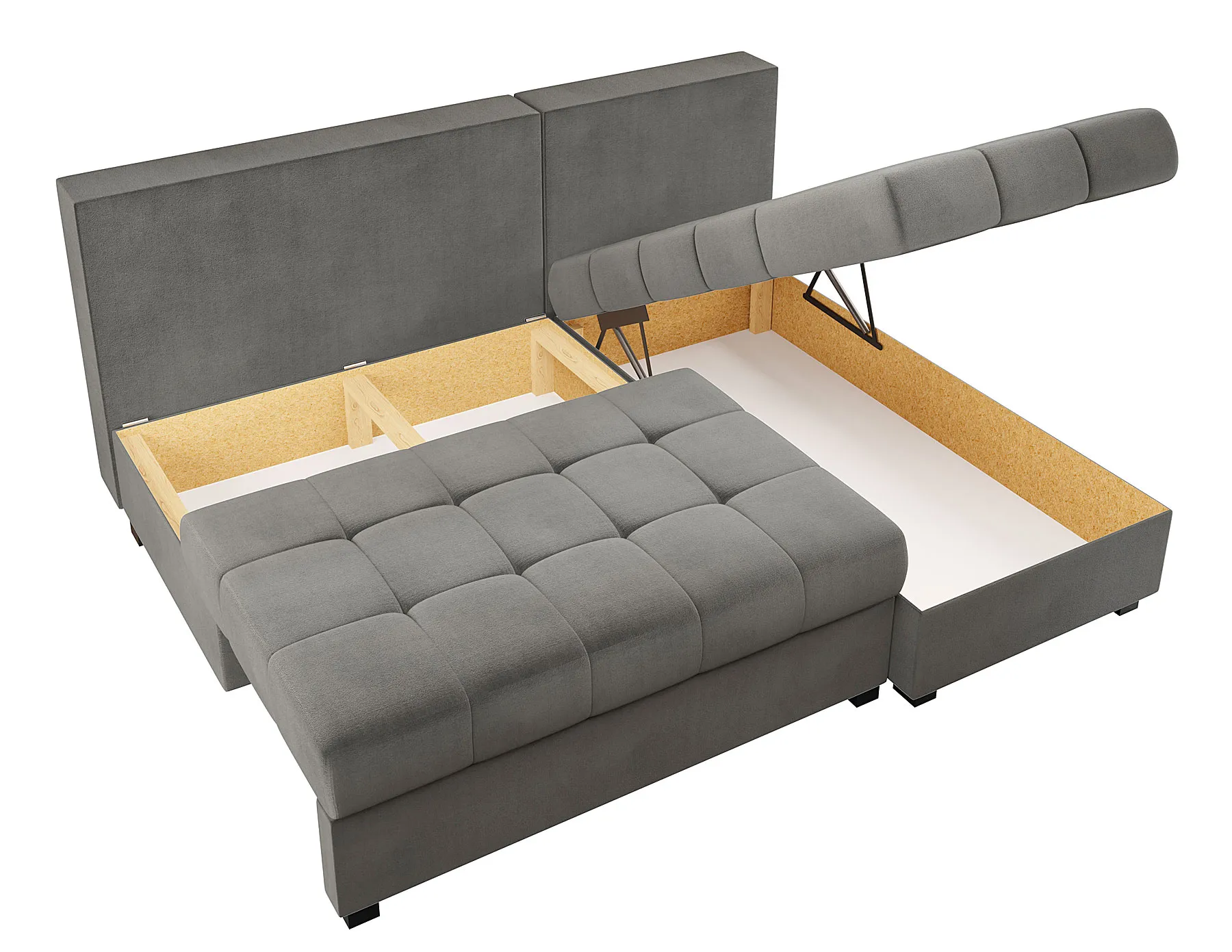 • Funkcja spania – w prosty sposób narożnik zamienia się w przestronne łóżko, idealne do przenocowania domowników lub gości.